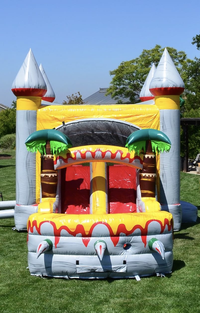 Dinosuar lovers this T-rex combo is just what you're looking for! Featuring a full-size bounce house and dual lane wet or dry slide. This unique combo is going to be the centerpiece of your Party! The T-rex combo will keep the kids busy for hours while the experience Dino sized thrills in this amazing unit! Our T-rex combo will be a huge hit at your next Birthday party, corporate event, BBQ, or any gathering!