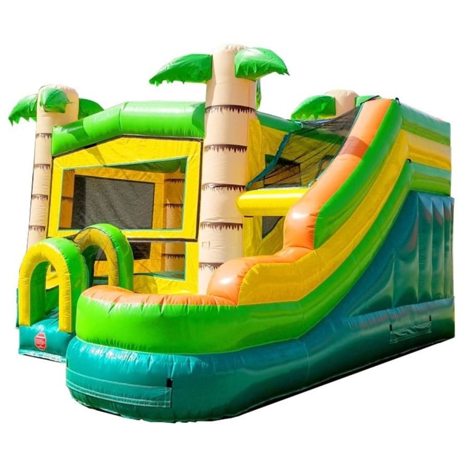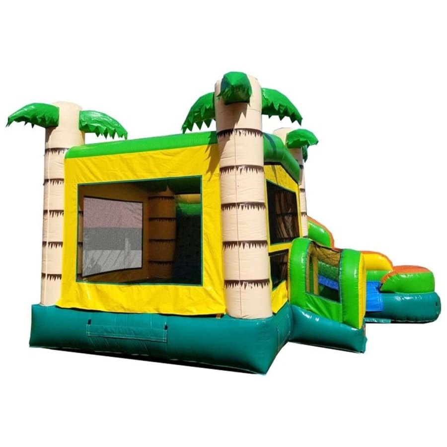 This Tropical Island themed combo will be a great addition to your next party! Jump on into a large bouncing area that has a basketball hoop and a non-slip rock wall leading to a slide on the outside where you will splash into the cool water making this unit perfect to cool down from the summer heat or use the slide dry and this unit can be great for any weather! This island themed combo will be perfect for any Luau, summer or jungle themed Event! It will surely be the centerpiece of your party!